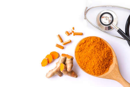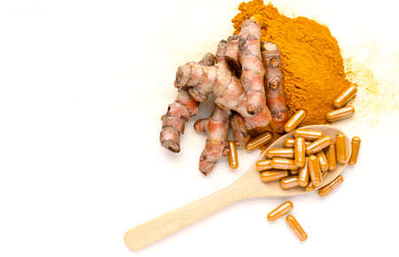 Organic curcumin or turmeric powder capsule on wooden spoon and fresh root on white background, for health care or alternative treatment concept