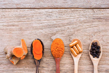 Tumeric root, turmeric slice, curcumin powder, Curcuma capsules and black pepper corn in wooden spoon isolated on wood table background. Health benefits and antioxidant food concept. Top view.