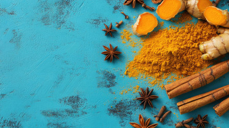 Close-up view of fresh turmeric root, powder, and various spices arranged on a bright blue background, highlighting their vibrant colors and textures.