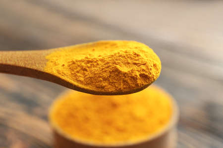 Spoon with aromatic turmeric, closeup