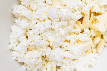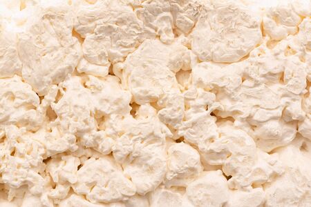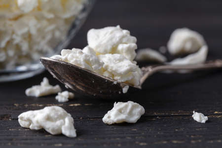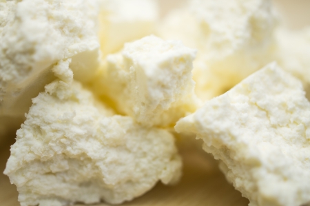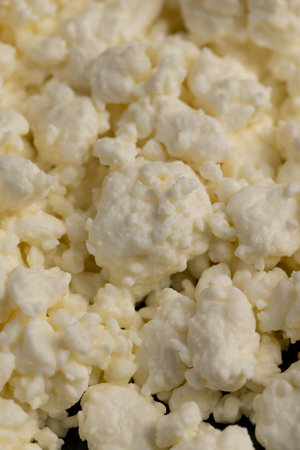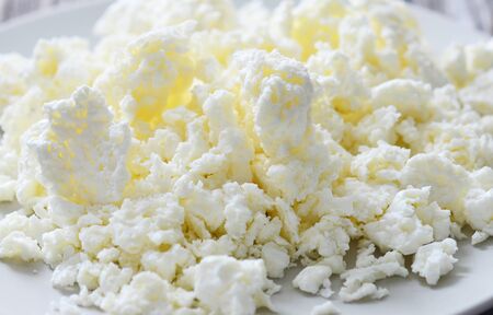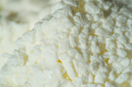 fresh cottage cheese made from milk in the form of lumps of white color, lumps of freshly made fermented milk product cottage cheese,