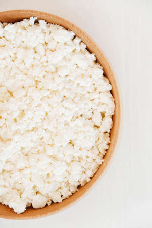 Fresh cottage cheese or ricotta or tvorog or curd cheese in a bowl. Selective focus