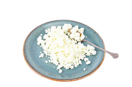 Blue plate with white grained homemade cottage cheese. Studio Photo