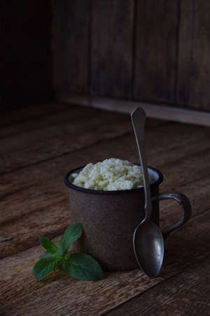 cooking delicious homemade cottage cheese in a saucepan on the table