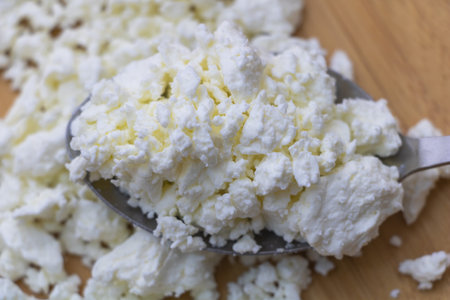 Fresh Crumbled White Cheese on a Spoon, Ready for Cooking or Serving.