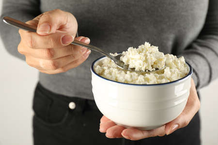 Tvorog, cottage cheese in a bowl. Healthy food, dieting concept