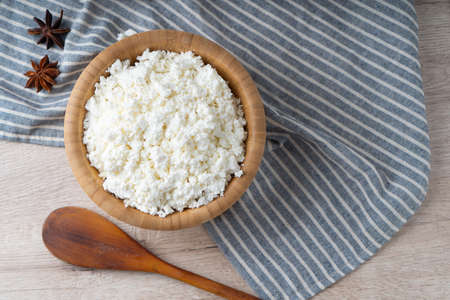 Cottage cheese in blue bowl and wooden spoon on table. Top view