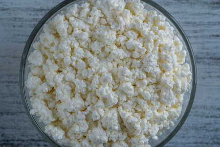 Cottage cheese in glass bowl of background, top view. White grainy texture of dairy product, cottage cheese close up. Dairy product concept