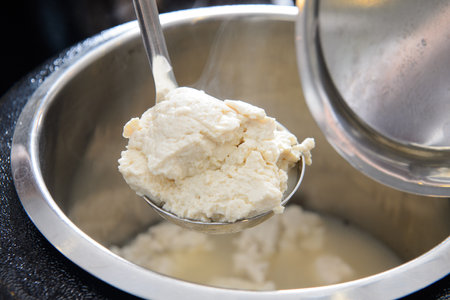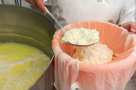 A woman working in a small family creamery is mixing a cheese batch. The dairy farm is specialized in buffalo yoghurt and cheese production.