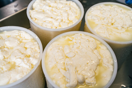 Filling molds for the production of soft cheese. The cheese blanks are soaked in brine. Selected focus. High quality photo