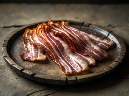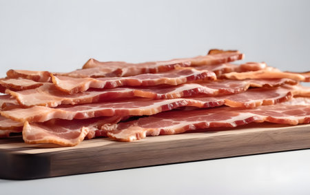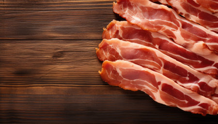 AI Generated. Savory raw bacon slices arranged on rustic wooden surface perfect for culinary and food styling compositions