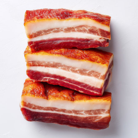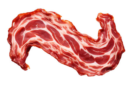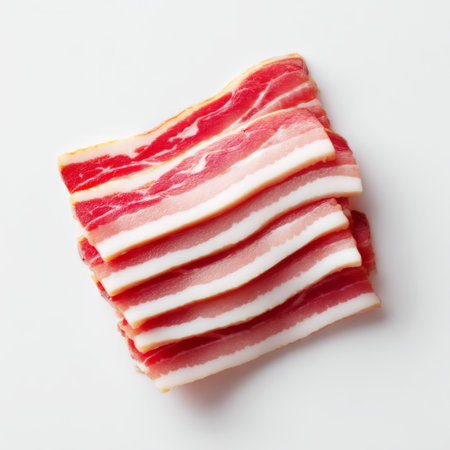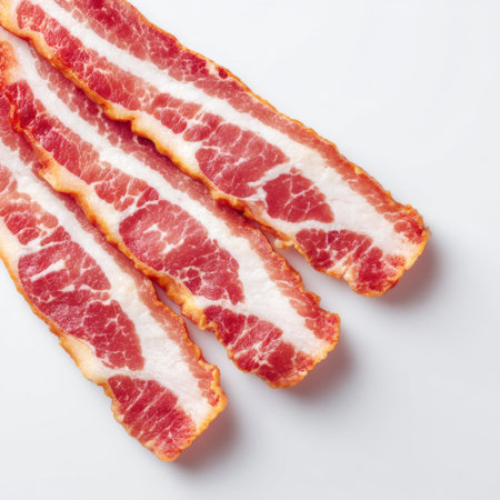 Freshly sliced bacon displayed on a white background, showcasing a rich texture and vibrant colors, ideal for culinary projects and food-related designs.