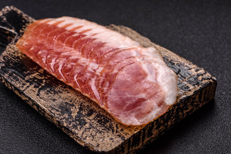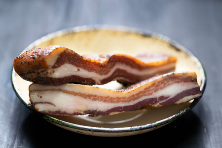 close up of rustic traditional dry cured smoked artisan gourmet bacon