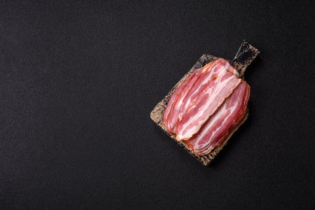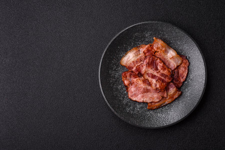 Fried bacon strips on the stone dark board