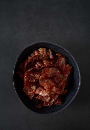 Fried crunchy Streaky Bacon pieces in a black plate.