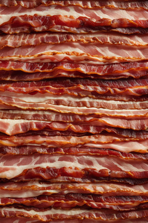 A tempting arrangement of crispy bacon strips displaying rich textures. Perfect for food-related projects, culinary blogs, and breakfast themes.