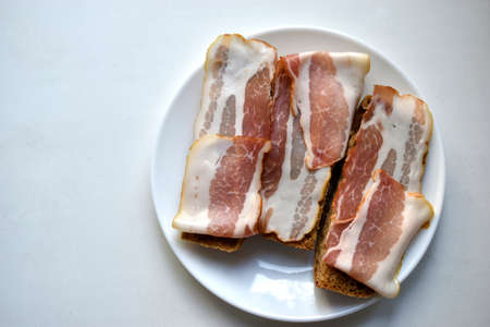 Fresh juicy bacon on a piece of rye bread