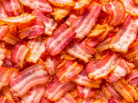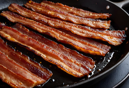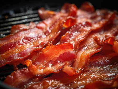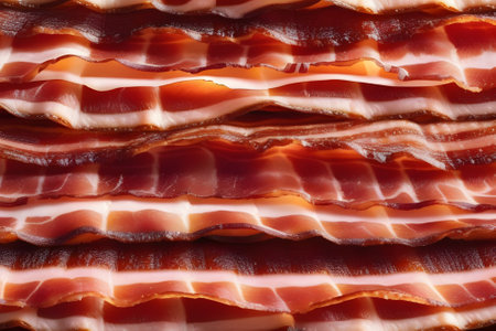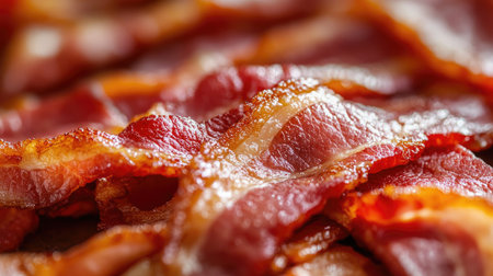 Close-up of crispy bacon strips showcasing their rich color and texture, perfect for breakfast or as a savory snack, evoking indulgence and flavor.