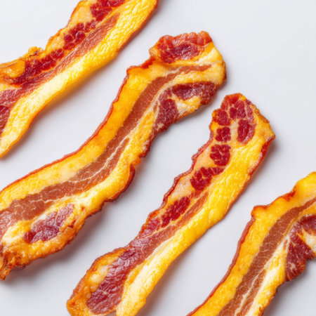 A close-up view of freshly cooked crispy bacon strips showcasing their juicy texture and vibrant colors against a clean white background. Ideal for food enthusiasts.