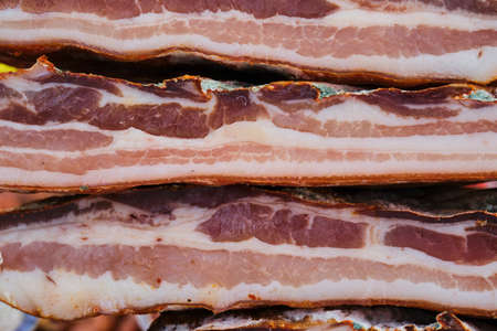 Meat, raw pork bacon sliced, organic food, protein for snacks. Raw bacon as a food background for your design