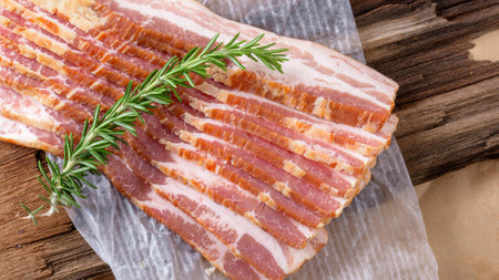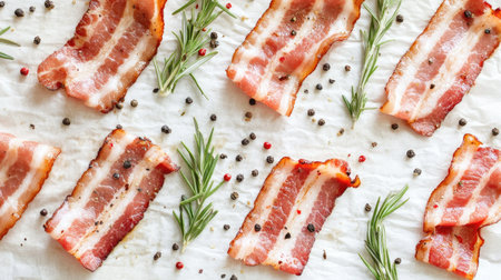 Fresh bacon strips laid out on a pale background with herbs and spices, creating a culinary masterpiece perfect for cooking inspiration.