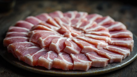 A stunning display of thinly sliced raw pork arranged in a circular pattern on a rustic wooden table. Ideal for culinary presentations and gourmet cooking.