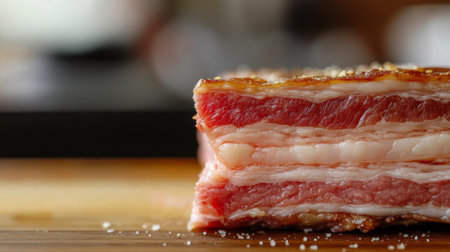 A close-up of raw pork belly with distinct layers of fat and meat, placed on a clean cutting board, ready for preparation, with a minimalist background