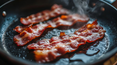 Bacon strips frying in a pan, preparing a savory breakfast meal