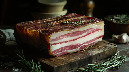 A beautiful display of freshly cured bacon on a wooden cutting board, surrounded by herbs and spices, perfect for culinary enthusiasts or gourmet cooking.