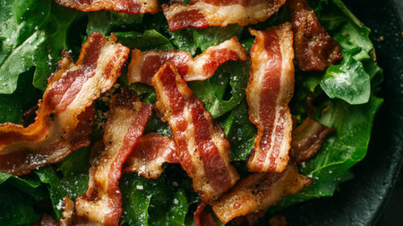 A vibrant salad featuring fresh greens topped with deliciously crispy bacon strips. Perfect for a nutritious meal or savory appetizer.