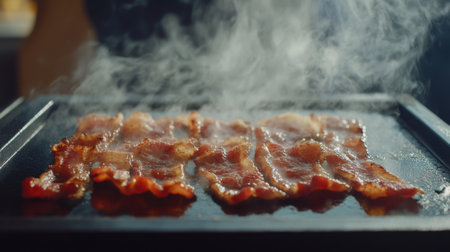 Freshly cooked bacon sizzling on a griddle, producing delicious steam in a cozy kitchen. Perfect for breakfast lovers and food enthusiasts alike.