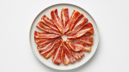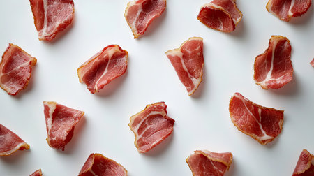 A vibrant display of fresh raw bacon strips arranged neatly on a white background, ideal for culinary presentations, recipe ideas, and food styling.