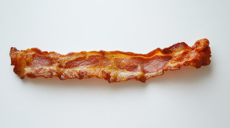 A single, crispy bacon strip placed on a clean white background. This image captures the deliciousness and indulgence associated with bacon as a breakfast or snack item.