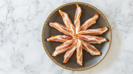 An artistic arrangement of fresh bacon strips on a dark plate, creating a star pattern. Perfect for culinary inspiration and food photography.