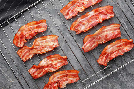 Cooling rack with tasty fried bacon on gray background