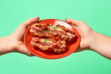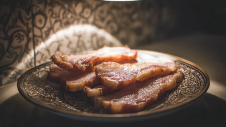 A beautiful plate featuring freshly cooked bacon, showcasing its crispy texture and rich colors. Perfect for food lovers and culinary enthusiasts.