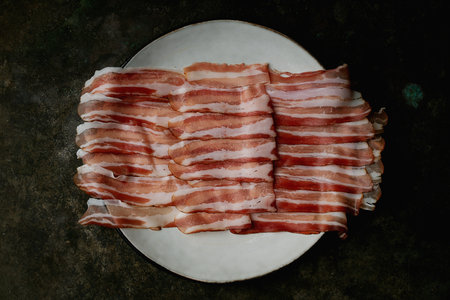 Thinly sliced bacon laid out on a white plate. The bacon strips display their marbled texture and vibrant color against a dark background, creating a contrast.