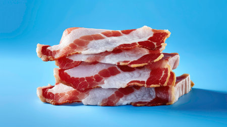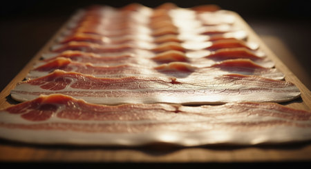 A close-up view of fresh bacon strips presenting vibrant colors and textures. Ideal for culinary visuals, food blogs, and marketing in the gastronomy sector.