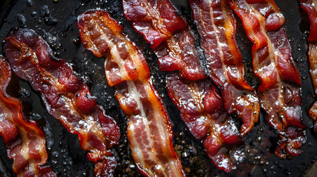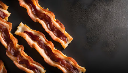 Close up shot of crispy bacon strips on a black surface. Perfect for breakfast, lunch, or snack.