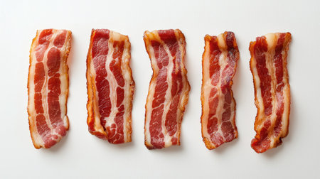 An arrangement of freshly cooked, crispy bacon strips on a clean white background. Ideal for food-related projects, recipes, or menus.