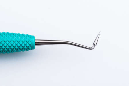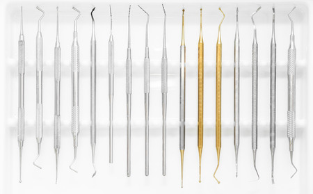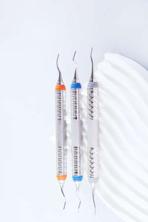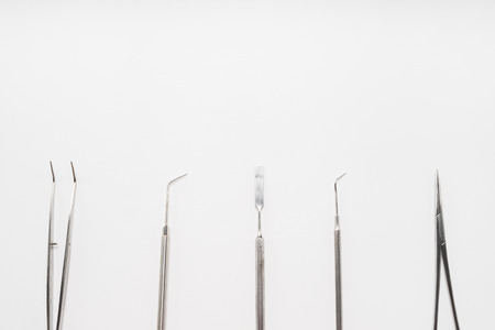 Set of metal dental instruments for dental treatment on white background. Medical tools. Close-up view. Shallow depth of field.