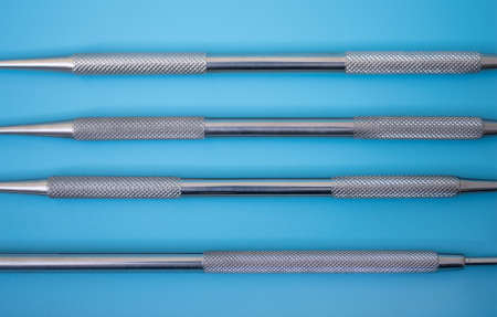 Close-up of dental scalers on blue background