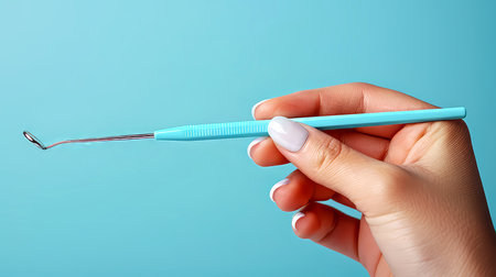 Dental tools in hand on a blue background close-up.