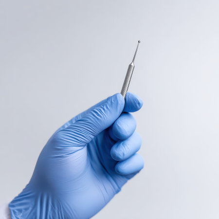 Close-Up View of a Gloved Hand Holding a Dental Tool Against a Light Background in a Clinical Setting