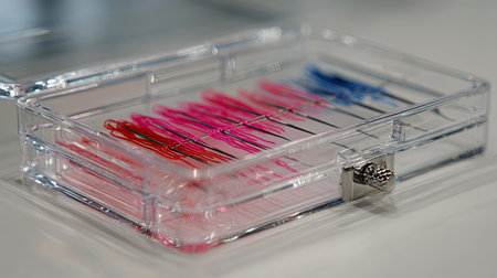 This image showcases a clear storage box filled with neatly arranged colorful hairpins, featuring shades of pink, red, and blue set against a white background.