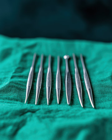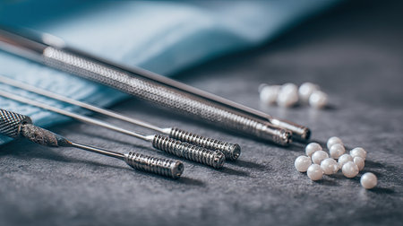 Polished stainless steel acupuncture instruments rest neatly on a crumpled white fabric, evoking calming ambiance suitable for holistic healing and integrative medic