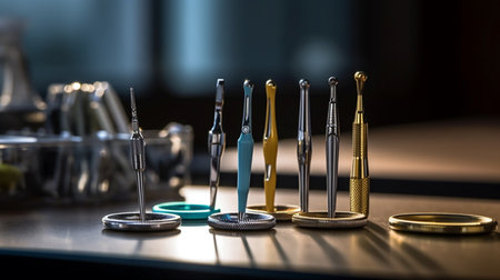 A close-up image showcasing precision tools arranged in a line on a dark background, highlighting their sleek design and shiny finish, ideal for artistic or professional use.