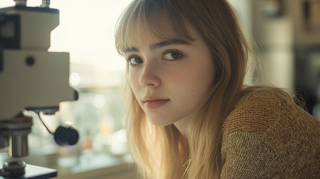 A woman with short hair sits in a laboratory full of scientific tools and materials. She appears focused and calm as she prepares for her work in research and experimentation.