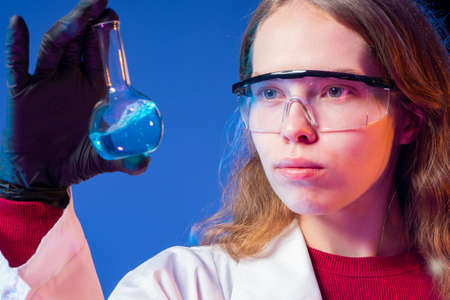 A female chemist with a test tube. Concentered female scientist wearing protective glasses and gloves. The girl examines the blue substance in the flask. Portrait of a female chemist.