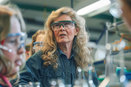 A science teacher wearing protective goggles is leading students in a laboratory experiment, ensuring safety and guidance during the educational process